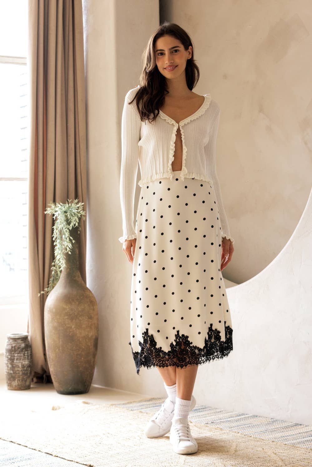 This cropped cardigan combines timeless elegance with modern sophistication. The flattering slim silhouette hugs your curves while the shortened hemline creates a chic, contemporary look. Luxuriously soft ribbed knit fabric moves with you, offering comfort without compromise. A delicate V-neckline framed with ruffled trim draws attention upward, while matching ruffle details at the cuffs and hem add romantic flair. The front placket and single hook-eye closure give you styling flexibility, wear it buttoned for polish or open as a layering piece. Perfect for elevating everyday outfits with understated femininity and texture.
