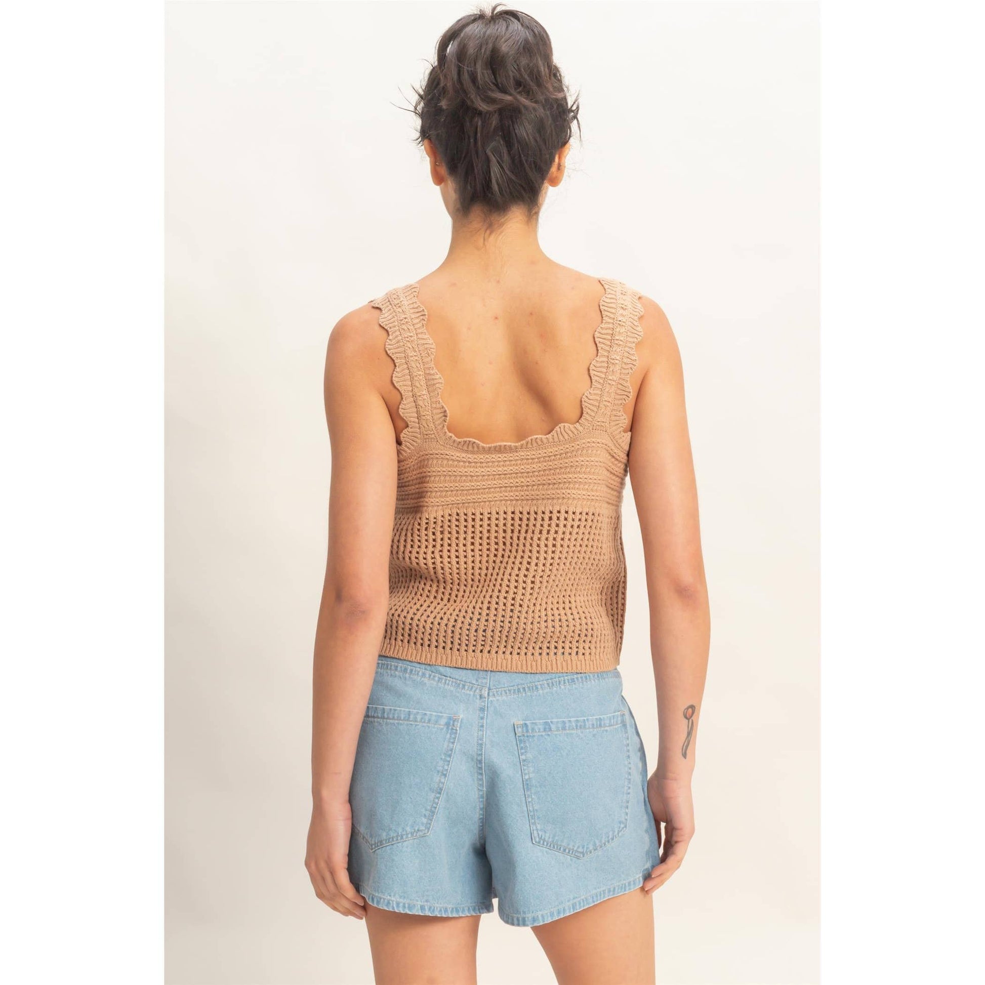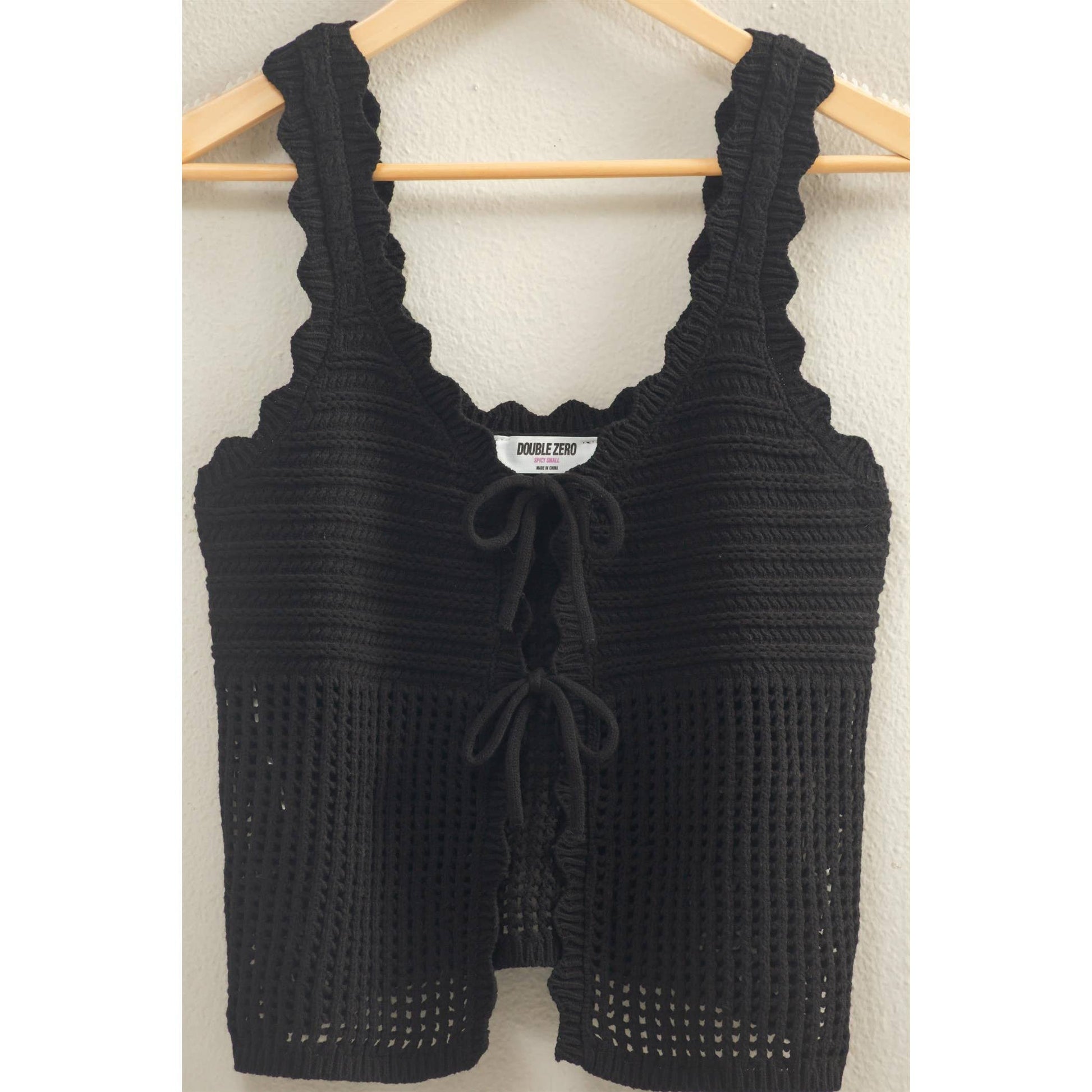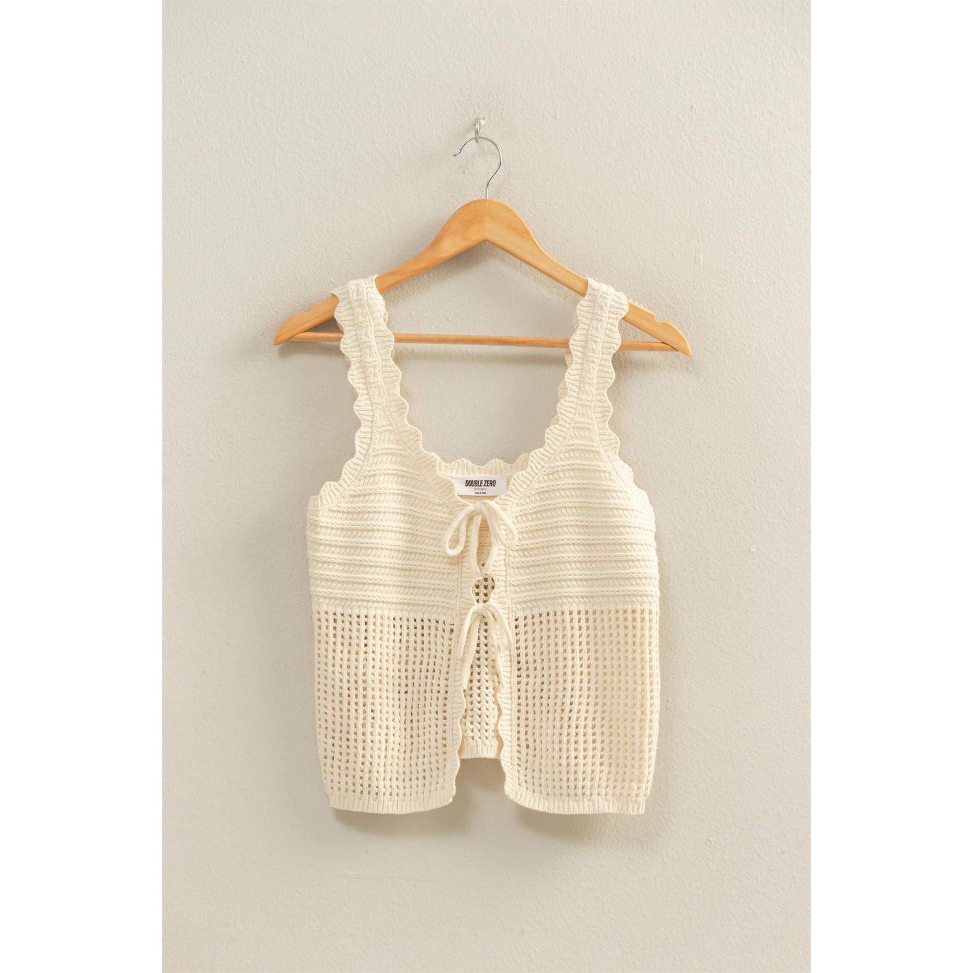 Embrace texture with this open-knit vest, featuring a deep V-neckline and double tie-front closures. The sleeveless silhouette is framed by scalloped edges along the armholes and hem. Constructed with mixed ribbing and mesh-grid stitching, it offers a standard fit. Layer over a fitted short-sleeve tee for a dimension-rich, textured ensemble.